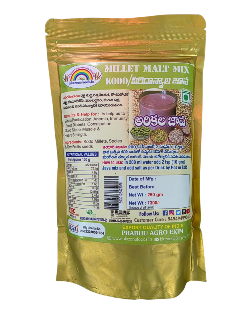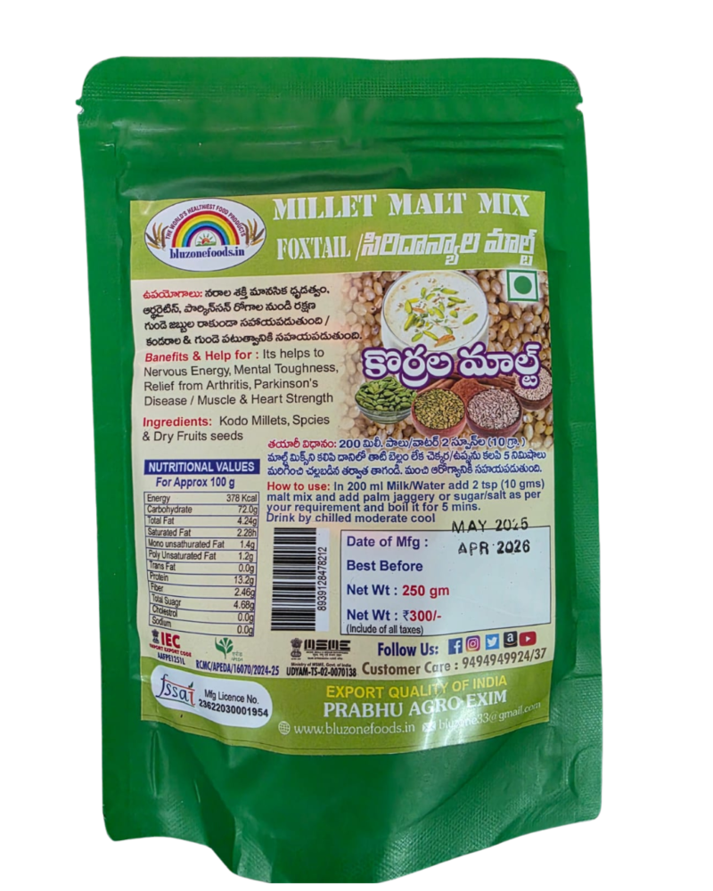 | MAIN INGREDIENTS | Contains Two Millet Packs and One Healthy Tea Mix Pack = Combo of 3 Pack, 250 g each Made from Barnyard Millet, Foxtail Millet, Mixed Spices, Ginger, Dry Fruit Seeds |