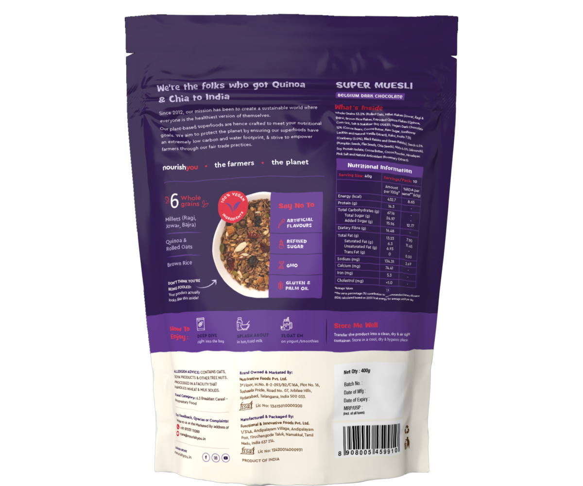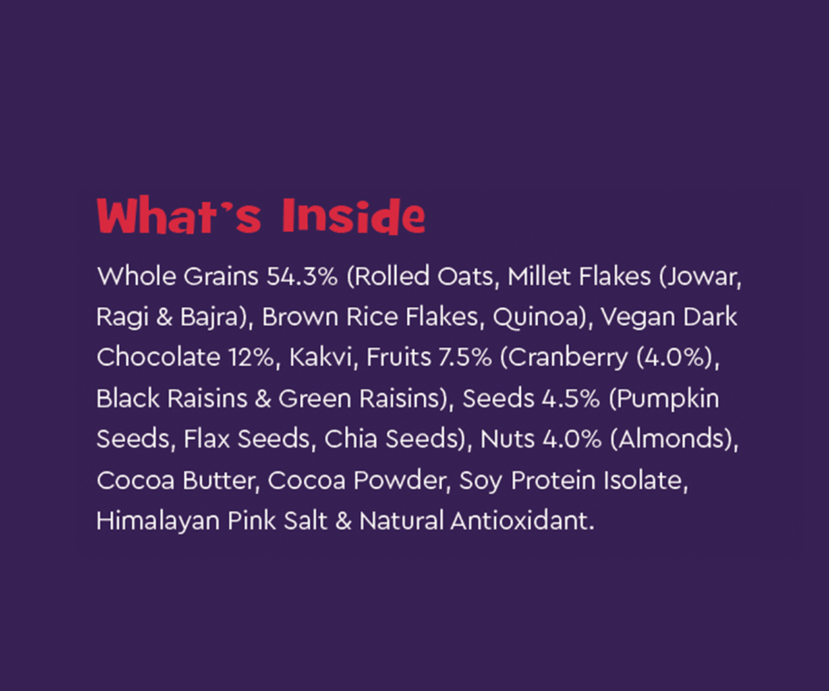 | MAIN INGREDIENTS | Blend of Super Grains, Vegan Dark Chocolate, Fruits and Nuts |