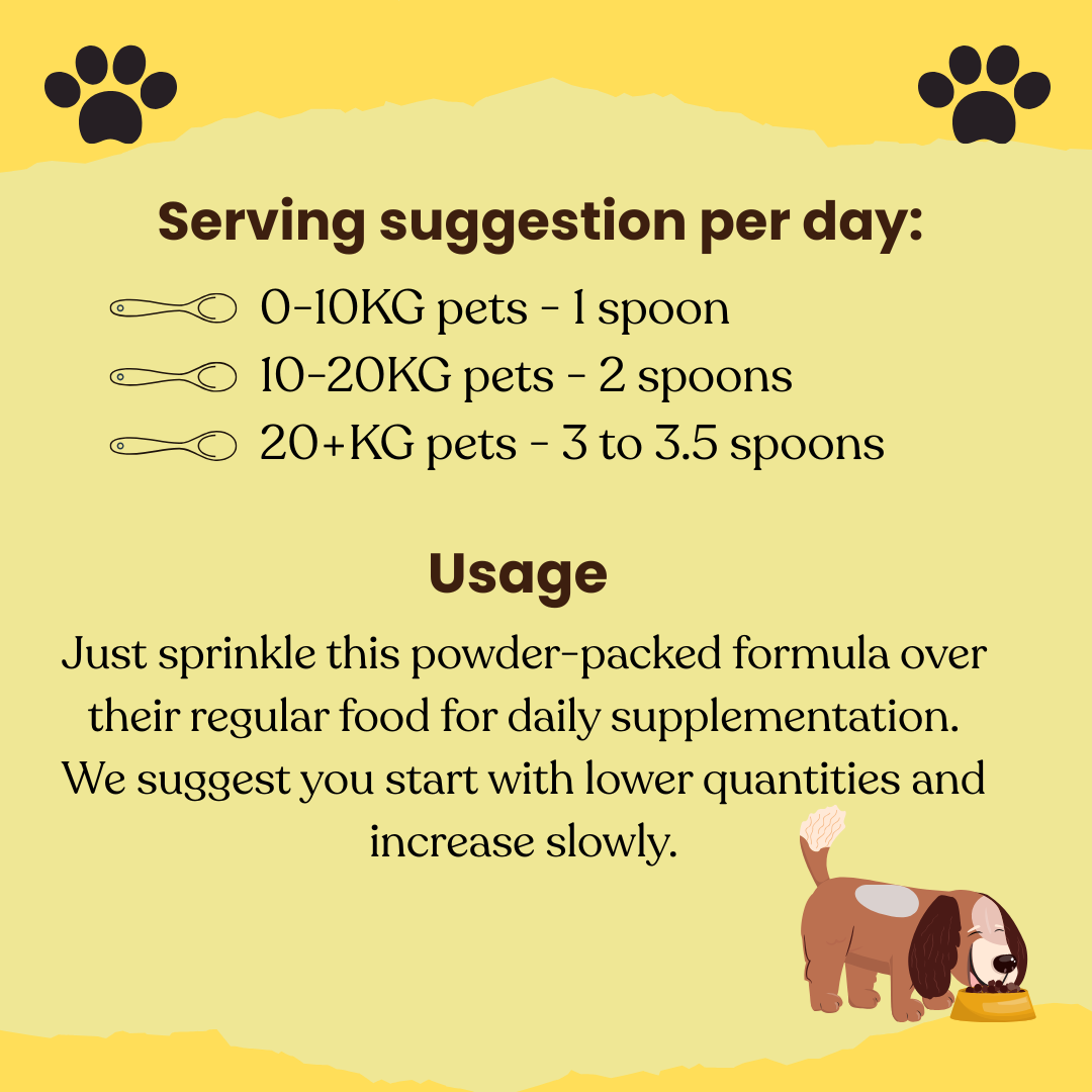 | HOW TO PREPARE | 0-10 kg Pet – 1 spoon per day 10-20 kg Pet – 2 spoons per day 20 kg+ Pets – 3 to 3.5 spoons per day Sprinkle over Pet’s regular food once a day Start with smaller quantity and increase slowly |