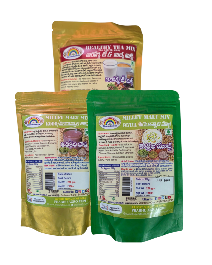 | MAIN INGREDIENTS | Contains Two Millet Packs and One Healthy Tea Mix Pack = Combo of 3 Pack, 250 g each Made from Barnyard Millet, Foxtail Millet, Mixed Spices, Ginger, Dry Fruit Seeds |